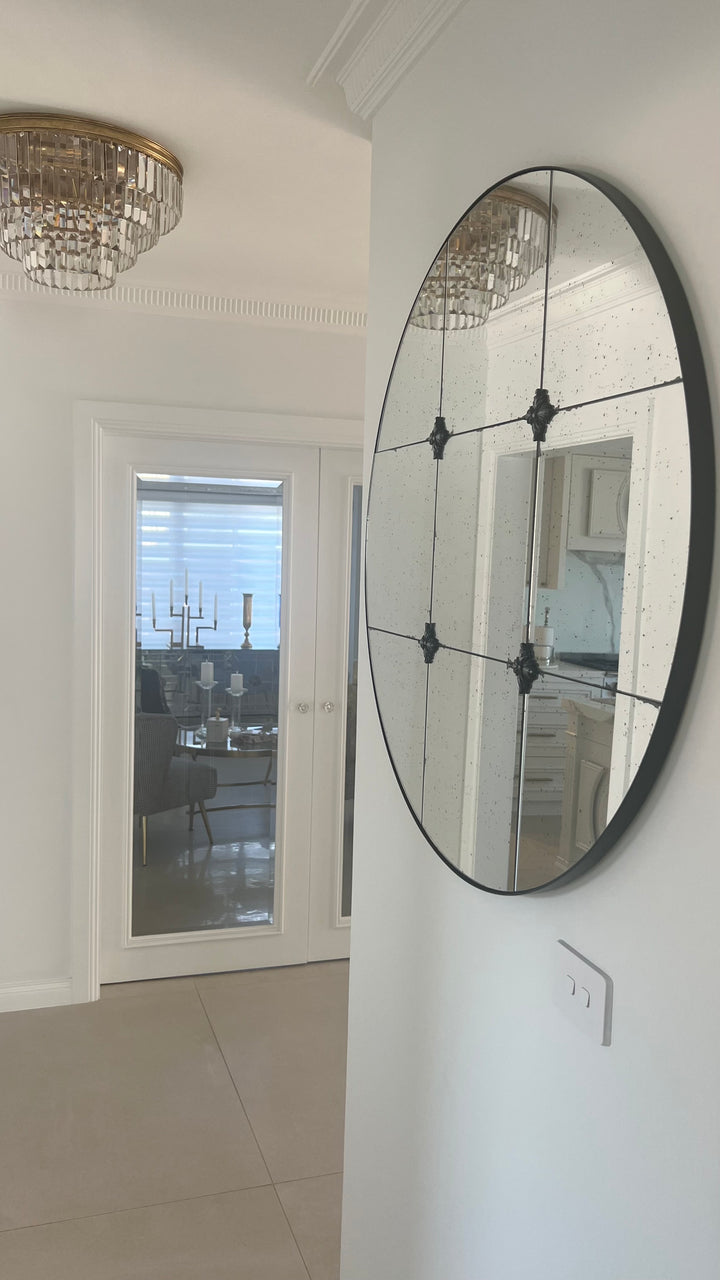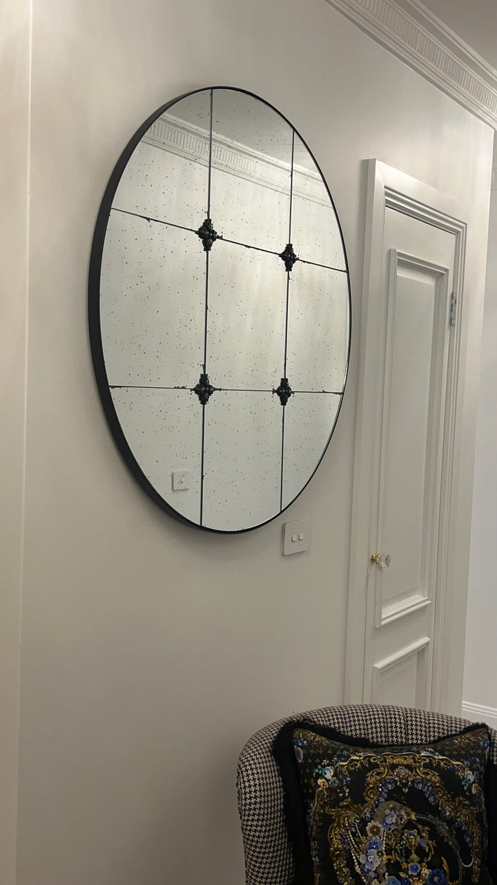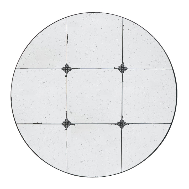 Transform your space into a haven of timeless elegance with our Round Antique Glass Mirror. This masterpiece, framed in sleek black iron and adorned with steel floral details is a captivating work of att that adds glamour to any room. The unique antique finish exudes old-world charm, making it perfect for creating a statement piece in your entryway, enriching the sophisticated ambiance of your living room, or above the bed for a touch of refined allure.