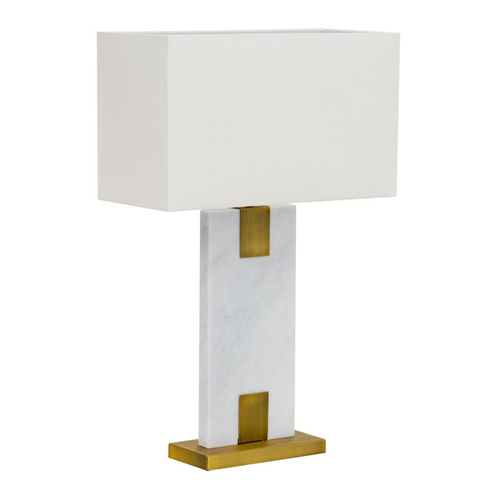 The Nikita table lamp enjoys a bold and streamlined silhouette where a striking white marble panel is embraced by antique brass metal accents. Nikita white rectangular shade perfectly complements its architecturally inspired base, creating an air of elegant luxury.