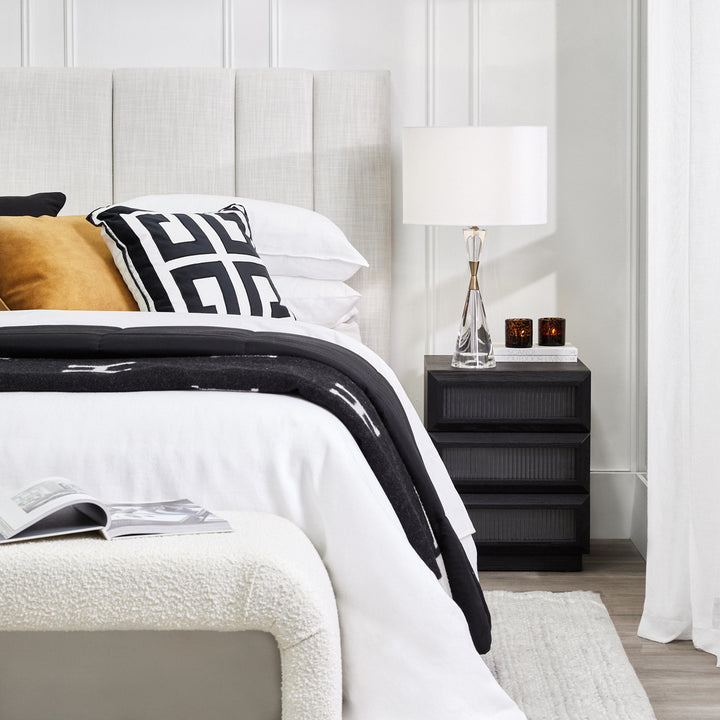The Sophia Lamp takes a hard angle on the transparency trend in design. The lamp's body is a geometric masterpiece with sharp angles and multiple facets. It's clear crystal form is complimented with a nickel rod extending all the way from its base to its pinnacle. Topped with a white linen drum shade.