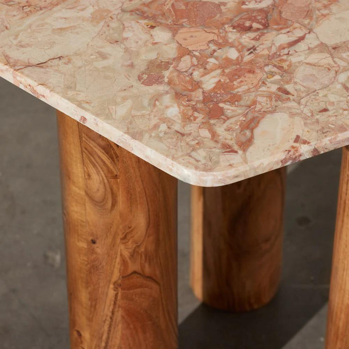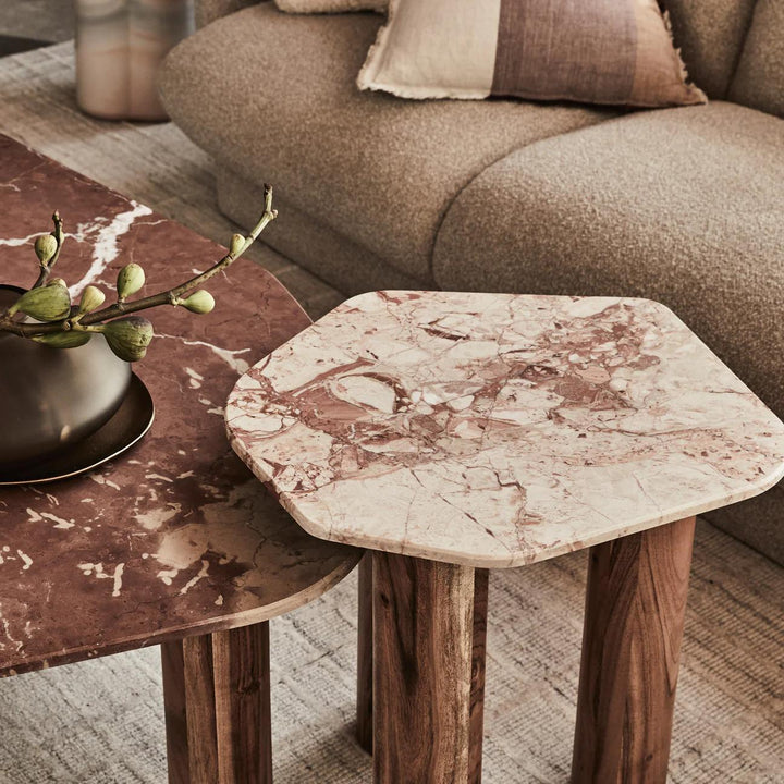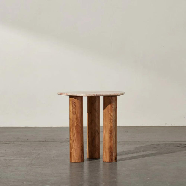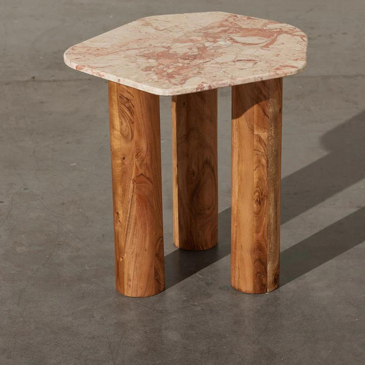 Meet the Waverly Table, a marble top side table that exudes sophistication. Its irregular rounded table shape, characterized by organic smooth lines, adds a grounded natural feel to a room. Crafted with meticulous attention to detail, the Waverly Table features three column-shaped wooden legs that harmoniously blend with the stone top material and texture. Select from two exquisite tabletop finishes: pink lagoon or onyx travertine. Each option showcases the inherent beauty of natural marble, allowing you to select the one that best complements your interior. The Waverly Side Table complements the Clifton Coffee Table, with slightly taller legs making it able to tuck on top the side of the coffee table like an extension of the tabletop space. This cohesive and stylish combination adds a touch of refined elegance to your living space.